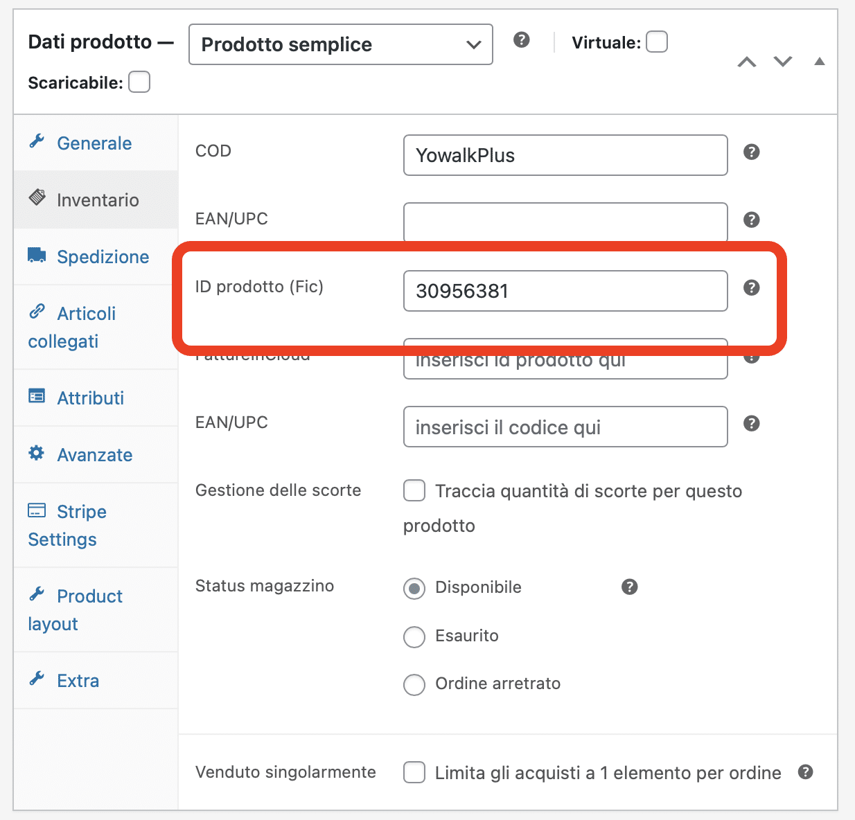 All’ interno di quel campo dovrà essere inserito l’ ID del prodotto corrispondente su Fatture in Cloud per poter abilitare la movimentazione del magazzino.