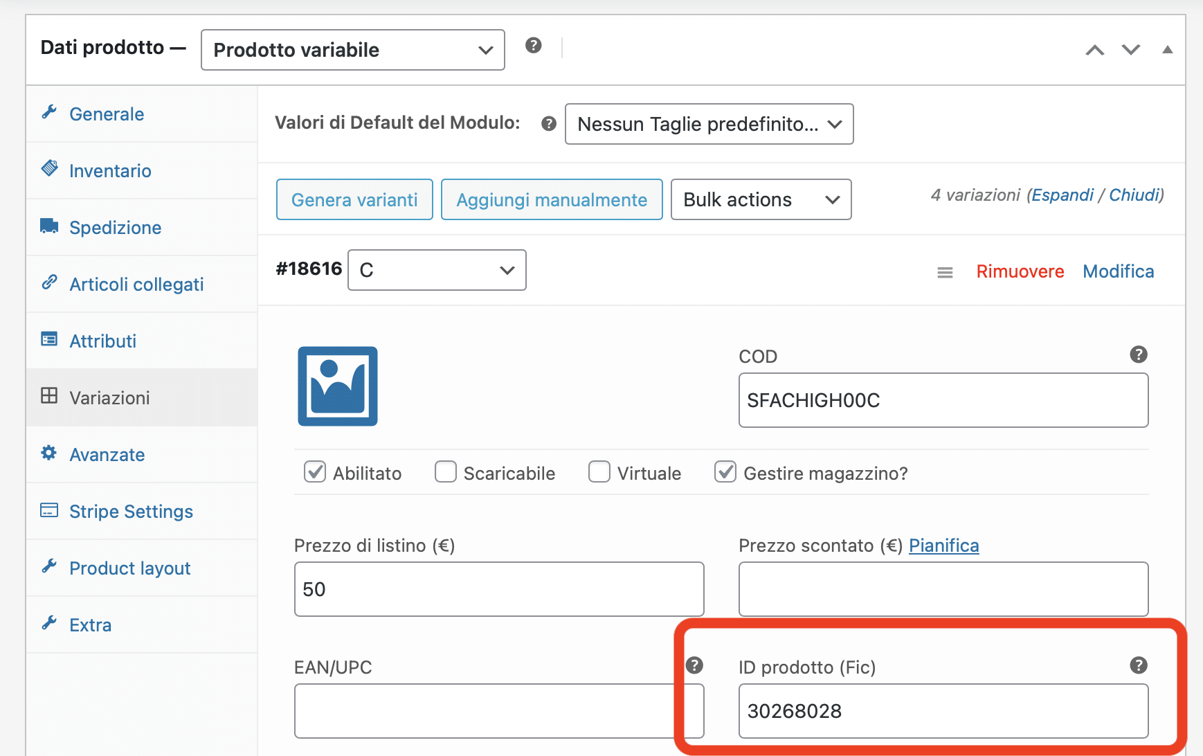 Perciò, una volta installato Ficoo (Versione Pro), per ogni prodotto singolo e per ogni variazione di prodotto variabile, verrà aggiunto un nuovo meta-dato chiamato “ID-prodotto”.
